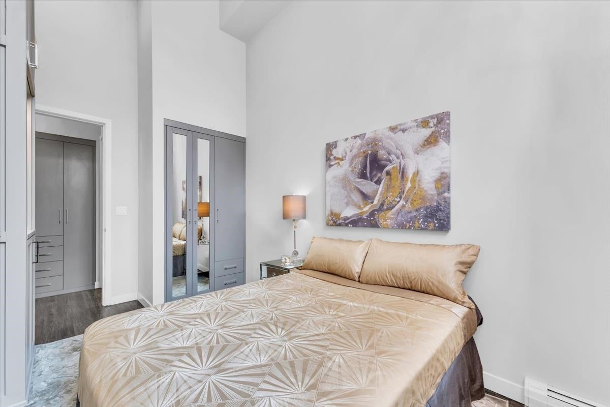 Rare concrete townhome featuring a private entrance and soaring 14 ft ceilings!. Located at Proximity by Bastion, this 1-bed + den residence offers a unique sense of space and direct access. The interior is appointed with Laminate flooring, Custom California Closets, and a gourmet kitchen featuring Caesarstone counters and full-size Fisher Paykel/Bosch appliances and a gas range. Extend your living space on the spacious 108 sq.ft. private patio surrounded in greenery. Situated next to Olympic Village, you are steps from the Seawall, Canada Line, and top-tier dining. Building amenities include a rooftop deck, lounge, and garden plots. Complete with 1 parking and 2 storage lockers. Pets and rentals allowed.